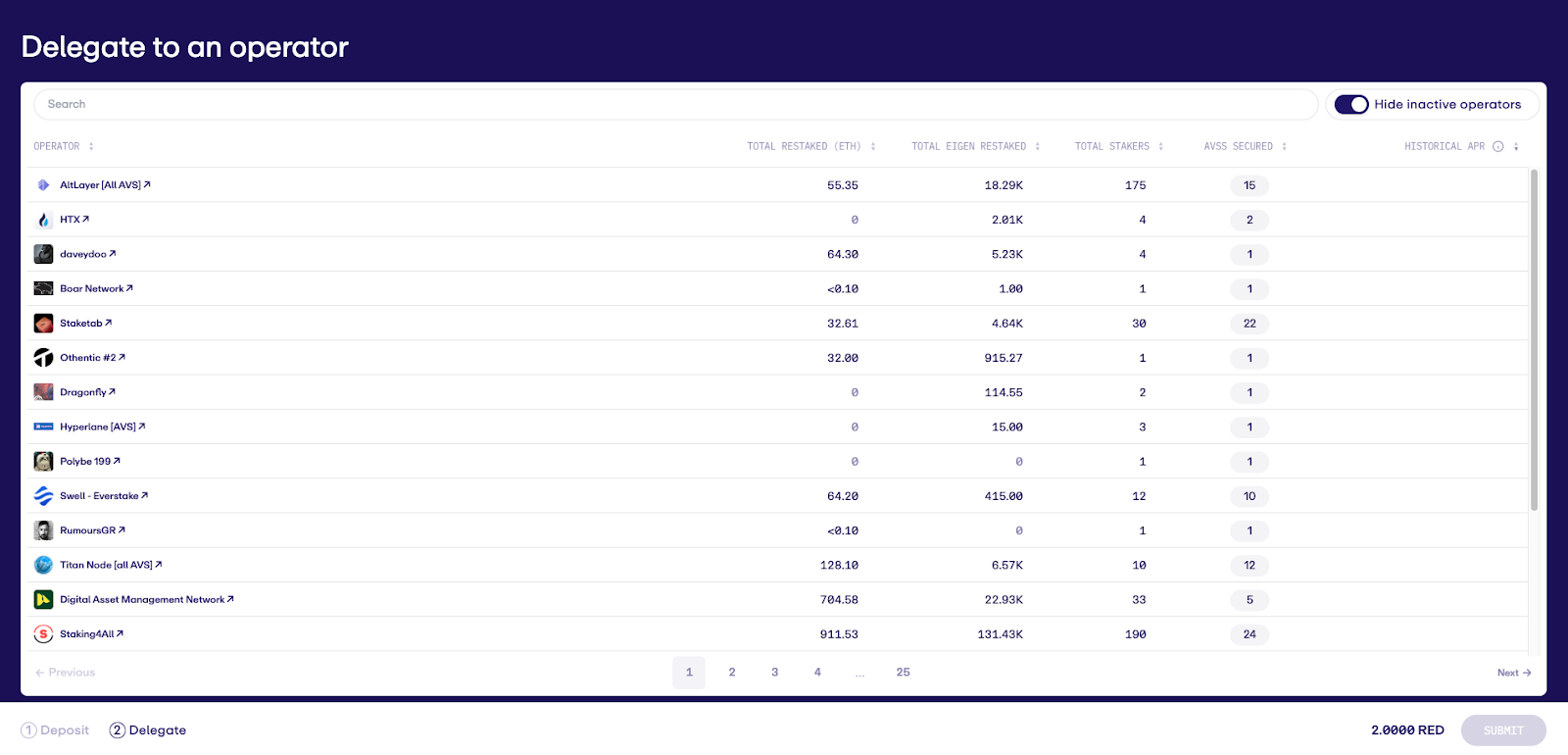 Now, you’re redirected to the delegation window. Select an operator to run the infrastructure staking your tokens, then click “Submit” and sign the transactions to finalize the process.