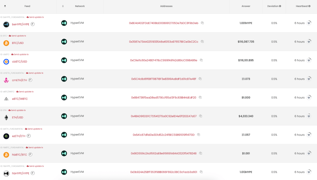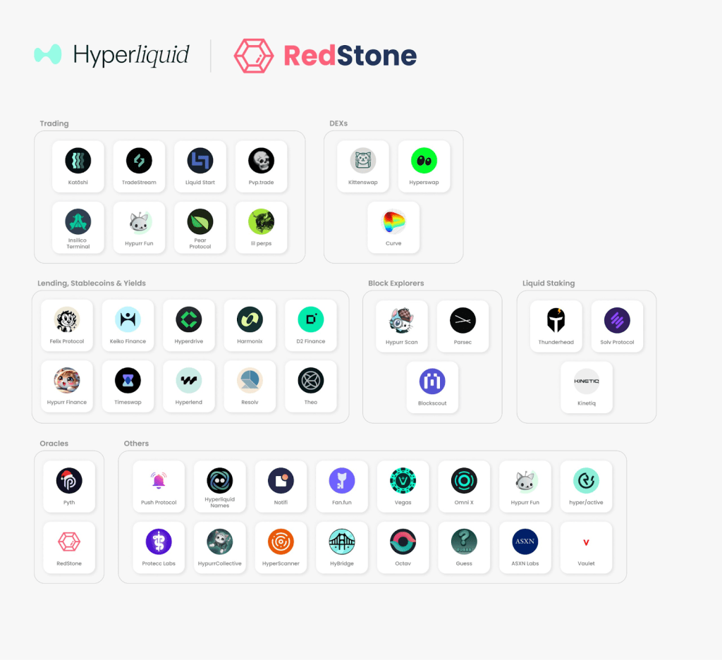 5. Multi-tier oracle architecture enables a comprehensive financial infrastructure with RedStone as the backbone. Hyperliquid’s vision of bringing all finance onchain creates unique oracle challenges across three distinct layers: native HyperCore markets with validator-embedded feeds, HIP-3 builder-deployed perpetual markets requiring deployer-specified oracles, and HyperEVM DeFi protocols needing comprehensive service. Each layer demands specialized technical capabilities and infrastructure. RedStone has emerged as the primary oracle provider across this multi-tier architecture, delivering the technical expertise and coverage needed to support Hyperliquid’s ambitious financial infrastructure goals, with a strong focus on the HIP-3 markets creation.