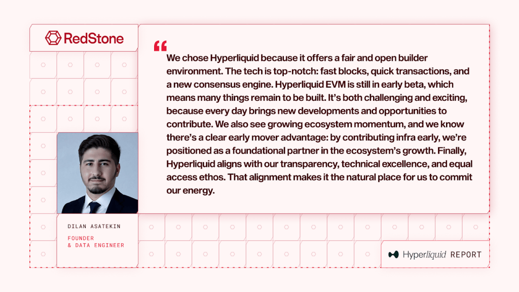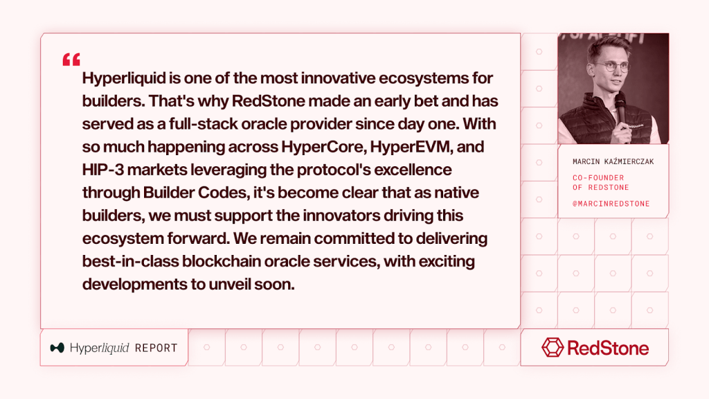 RedStone has been supporting every oracle need of the HyperEVM ecosystem from day one and is now leveraging its expertise to deliver the most comprehensive oracle coverage for HIP-3 markets. Hyperliquid’s vision of bringing all finance onchain is what RedStone has been striving toward since inception.