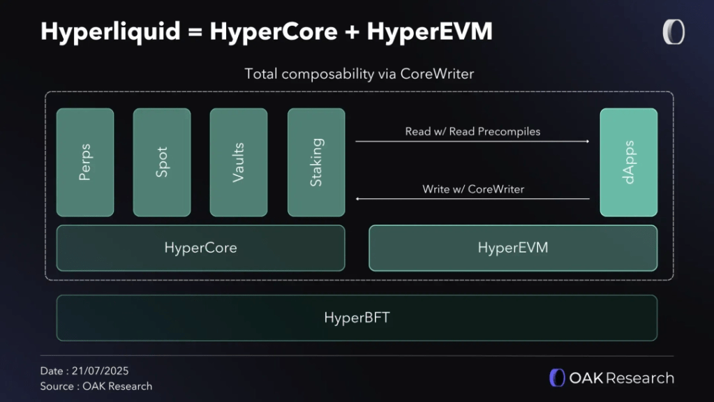 CoreWriter functions as the essential connector that allows HyperEVM applications to write directly to HyperCore’s native systems, eliminating the need for trusted intermediaries. This represents the missing piece needed to complete HyperEVM’s role, transforming it from what many considered just another EVM chain into something fundamentally different: a chain that directly and natively inherits access to the performance, liquidity, and onchain order book of Hyperliquid. Previously, smart contracts could only read HyperCore data like positions and prices, but CoreWriter, launched on July 5th, enables bidirectional interaction between Hyperliquid’s two execution layers.