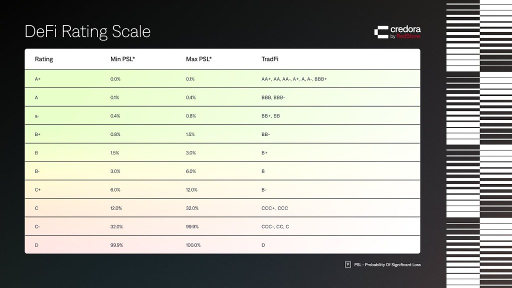 Credora’s DeFi rating scale. A single, quantitative standard for comparing risk across DeFi protocols, assets, markets, and vaults.